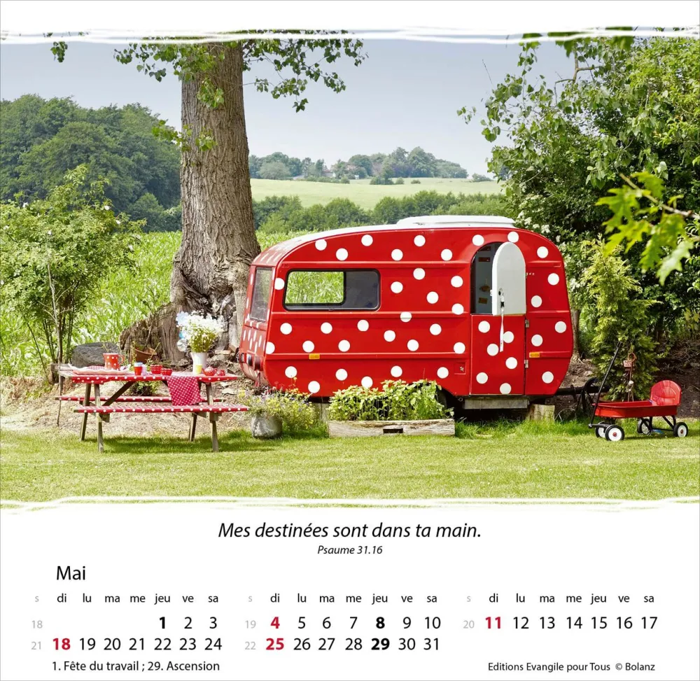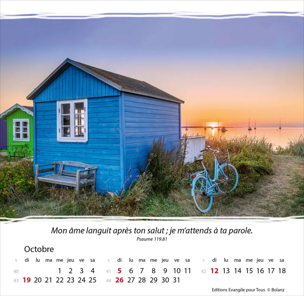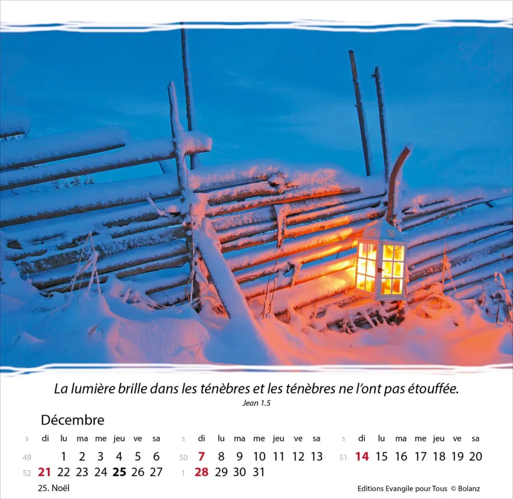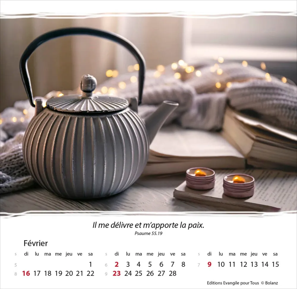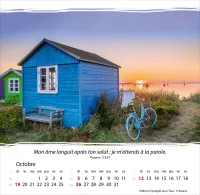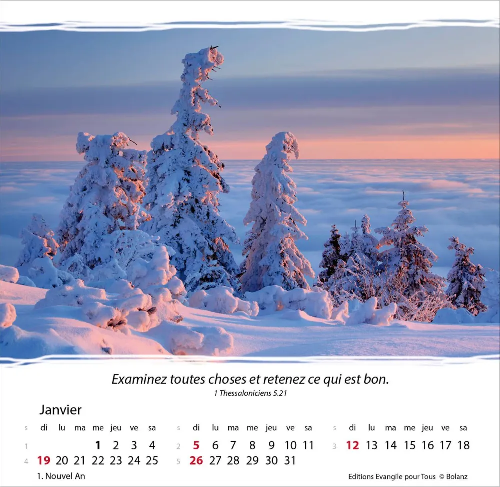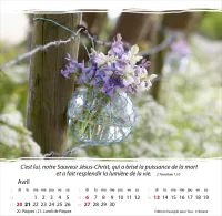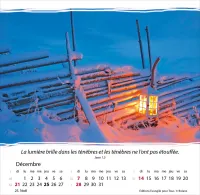 Calendrier à offrir, avec une méditation du texte biblique au verso. Espérance et confiance pour toute l’année. 12 belles photos, des versets bibliques appropriés, avec spirale et support pour poser. Cartes avec versets bibliques à découper.