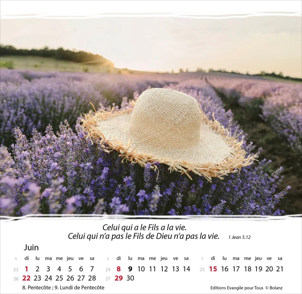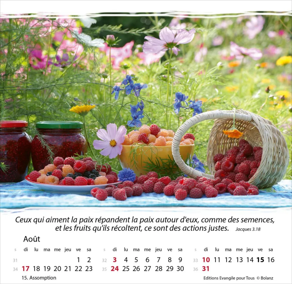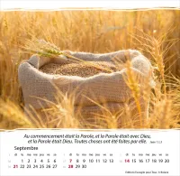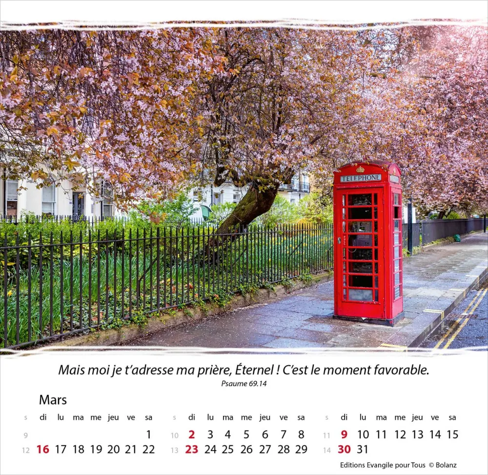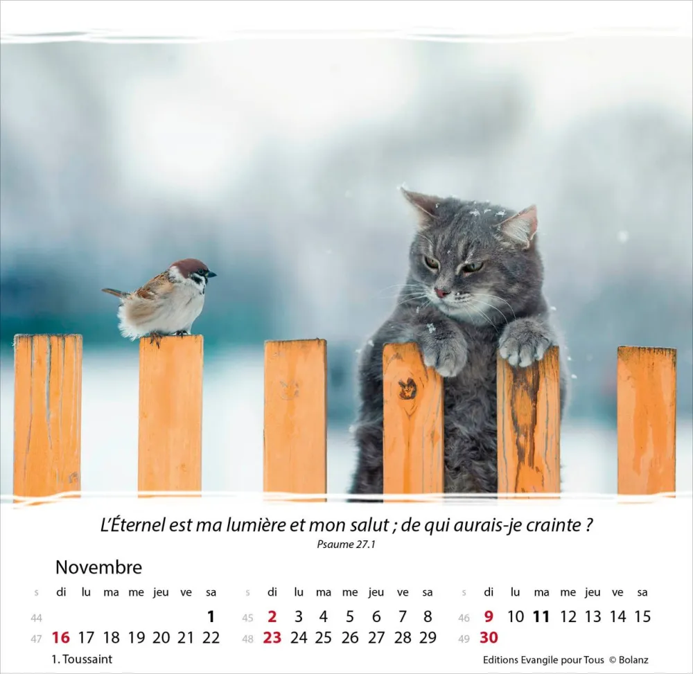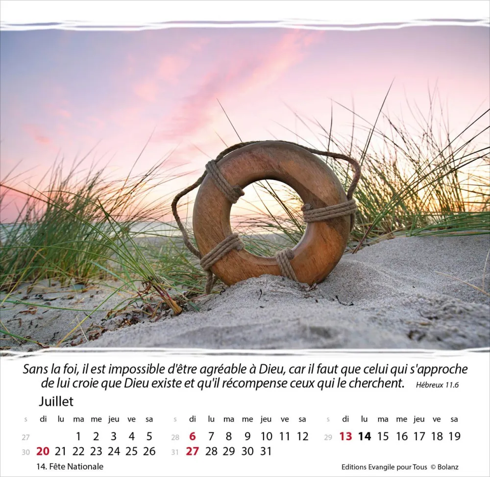 Calendrier à offrir, avec une méditation du texte biblique au verso. Espérance et confiance pour toute l’année. 12 belles photos, des versets bibliques appropriés, avec spirale et support pour poser. Cartes avec versets bibliques à découper.
